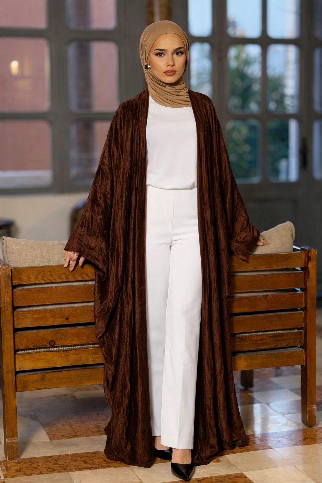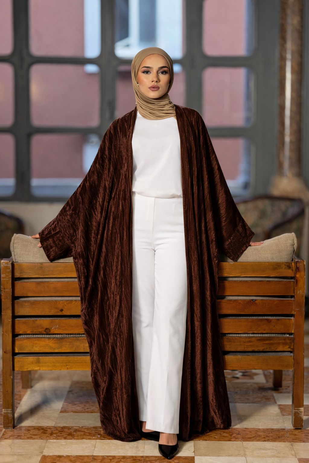 A velvet abaya collection featuring elegant silhouettes, rich tones.